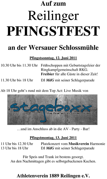 Zum einjährigen Bestehen der Ringkampfgemeinschaft mit dem RSV Hockenheim gibt es am Sonntag zum Beginn von 10.30 bis 11.30 für alle Gäste Freibier! Special Event am Sonntag Abend ist die Band stageboxx, die ab 18 Uhr live aufspielen wird. Die Ringerbar ist an diesem Abend natürlich auch wieder geöffnet. Am Pfingstmontag wird der Musikverein Harmonie von 11 bis 12.30 Uhr zum Frühschoppen aufspielen. An den Nachmittagen gibt es wieder leckeren, selbstgebackenen Kuchen von den Ringerfrauen. Der Athletenverein freut sich auf Ihren Besuch. müm