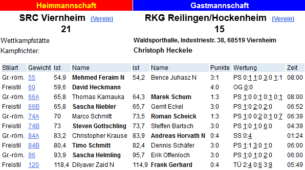 Zum Rückrundenstart musste die RKG eine schmerzhafte 21:15 Niederlage beim SRC Viernheim hinnehmen. Hier die Einzelergebnisse vom Derby: