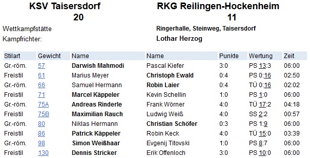 Insgesamt ein völlig überraschender und deutlicher 20:11 Heimsieg für den KSV Taisersdorf, der am 17.Kampftag seinen zweiten Saisonsieg feiern durfte. Schockstarre herrscht hingegen bei der RKG, die an diesem Abend ihre sonst so hoch gelobten und starken Tugenden komplett vermissen ließ: Geschlossene Mannschaftsleistung, Kampfgeist und absoluten Siegeswillen. Ausgerechnet in einem so wichtigen Kampf enttäuschte das Team von Coach Wolfgang Laier seine Fans. Dieser zieht auch ein ernüchterndes Fazit: „Heute haben wir in vollem Maße enttäuscht, wir wollten die zwei Punkte mitnehmen und uns damit die Option offenhalten, um am letzten Kampftag aus eigener Kraft den achten Tabellenplatz verlassen zu können. Scheinbar haben heute einige den Kampf für einen Selbstläufer gehalten, das wird uns nicht mehr passieren. Vor allem für die mitgereisten Fans tut es mir leid, allerdings kann ich versprechen, dass wir am kommenden Samstag alles dafür geben werden, die heutige Leistung wieder gut zu machen.“