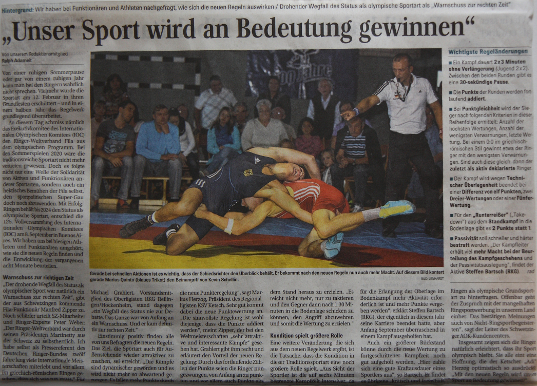 Heute hat die Schwetzinger Zeitung in Person von Ralph Adameit einen tollen Artikel zum Thema Ringen, Regeländerungen usw. gebracht. Herr Adameit hat Sportler und Funktionäre zum Thema Olympia und Regeländerung befragt. Zum Vergrößern bitte den Artikel anklicken. Quelle: Schwetzinger Zeitung 10.10.2013 Autor: Ralph Adameit (RAD)