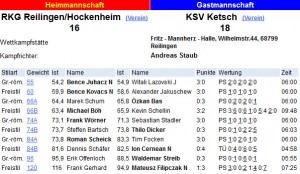 Durch einige taktische Umstellungen des RKG-Trainers Michael Böh und eine fantastische Mannschaftsleistung, fiel die Entscheidung erst im letzten Kampf des Abends, Klasse bis 74kg freier Stil, zwischen Steffen Bartsch und Thilo Dicker. Hier hatte Thilo Dicker für die Ketscher die Nase vorn, konnte 3 Mannschaftspunkte holen und den Sieg von 16:18 für die Ketscher perfekt machen. Doch der Reihe nach.