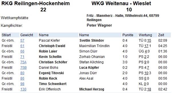 Der Abend in der Reilinger Fritz-Mannherz-Halle begann für die RKG jedoch nicht erfreulich: Zum Start verlor Pascal Kiefer (57 Kilo Griechisch-Römisch) gegen Svetlin Shindov nach technischer Überlegenheit. Ähnlich erging es Schwergewichtler Erik Offenloch im zweiten Kampf des Abends gegen Michael Herzog. Der RKG Routinier konnte beim 2:18 allerdings auch Punkte für sich verbuchen. Nach dem schlechten Start legte die Ringkampfgemeinschaft allerdings eine beeindruckende Serie von sieben Siegen auf die Matte. Eingeläutet wurde diese von Christoph Ewald (61 Kilo Freistil), der einen Überlegenheitssieg feiern durfte. Im Halbschwergewicht blieb Timo Schweikert ohne Gegner und im letzten Kampf vor der Pause rundete Robin Laier (66 Kilo Griechisch-Römisch) seine starke Saison mit einem 4:0 Sieg gegen Simon Dürr ab. Allerdings hatte der Athlet aus Weitenau Übergewicht und somit gingen vier Punkte an die Hausherren, die mit einer 12:8 Führung in die Pause gingen.