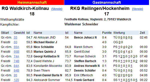 Erfreulich aus RKG-Sicht war unter anderem der Schultersieg von Frank Gerhard gegen Aleksandr Sommer in der Klasse bis 120kg freier Stil. Hatte Sommer im Vorkampf noch mit 0:3 Runden gegen Ümit Kahyaoglu gewonnen, gab er im Rückkampf die vollen vier Punkte ab.