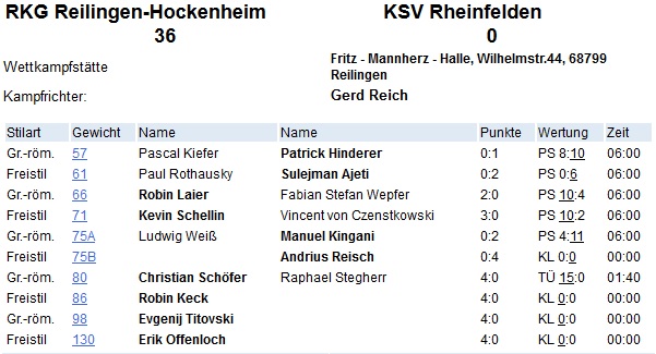 Die Gäste von der Schweizer Grenze kamen mit einem Rumpfkader in die Kurpfalz und mussten entsprechend die Punkte in der Reilinger Fritz-Mannherz-Halle abgeben. Die Reilinger Leistungsträger Robin Keck (86 Kilo Freistil), Evgenij Titovski (98 Kilo Griechisch-Römisch) und Routinier Erik Offenloch (130 Kilo Freistil) blieben an diesem Abend ohne Gegner. Die RKG ließ im Gegenzug die Klasse bis 75 Kilogramm Freistil leerlaufen. Obwohl der eigentlich Wettkampfcharakter an diesem Abend verloren ging, schenkten sich die Athleten auf der Matte nicht das Geringste. So lieferte sich RKG Fliegengewichtler Pascal Kiefer (57 Kilo Griechisch-Römisch) ein packendes Duell mit Patrick Hinderer, bei dem der Reilinger letztendlich knapp mit 8:10 den Kürzeren zog. Und auch der junge Paul Rothausky (61 Kilo Freistil) musste gegen den erfahrenen Sulejman Ajeti Lehrgeld bezahlen und verlor mit 0:6. Beachtlich ist allerdings, dass Ajeti in der Hinrunde noch den RKG Rumänen Badea ohne Probleme schulterte, was eindeutig für die Leistung Rothauskys spricht. Von den insgesamt sechs Kämpfen verlor die RKG noch im klassischen Stil des Weltergewichts (75 Kilo), in dem Eigengewächs Ludwig Weiß dem Rheinfeldener Leistungsträger Manuel Kingani allerdings sehr gut Paroli bot und mit 4:11 verlor. Die Leistung des ehemaligen deutschen Junioren Meisters ließ große Hoffnung für die Zukunft.