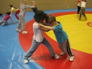 Anschließend wurden einfache Ringertechniken wie Schieben und Ziehen geübt. Hier zeigte sich, wie schnell man Hemmungen und Ängste durch die Zweikampfsportart Ringen überwinden kann. Eingeteilt nach Körpergröße und Gewicht durften die Kinder beim anschließenden Ringel- Rangel- Turnier ihre zuvor erlernten Techniken anwenden.