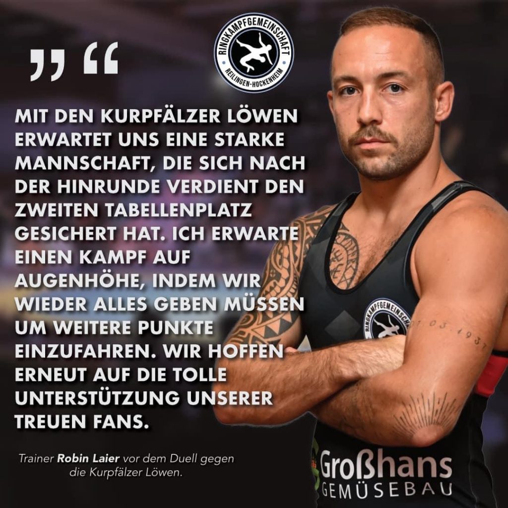 Mit einem klaren Derbysieg vor heimischen Publikum reist die RKG Reilingen/Hockenheim mit breiter Brust direkt zum nächsten lokalen Duell in der 2. Ringen-Bundesliga. In der KSV-Halle in Schriesheim muss die Ringkampfgemeinschaft am Samstag, 19.30 Uhr, gegen die Kurpfälzer Löwen antreten und kann mit einem weiteren Derbyerfolg einen extrem wichtigen Schritt in Richtung Klassenerhalt gehen.